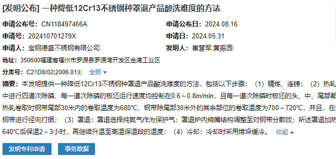 2024年8月16日,寶鋼德盛不銹鋼有限公司成功申請(qǐng)一項(xiàng)名為“一種降低12Cr13不銹鋼種罩退產(chǎn)品酸洗難度的方法”專利,申請(qǐng)公布號(hào)為CN118497466A,申請(qǐng)日期為2024年5月31日。